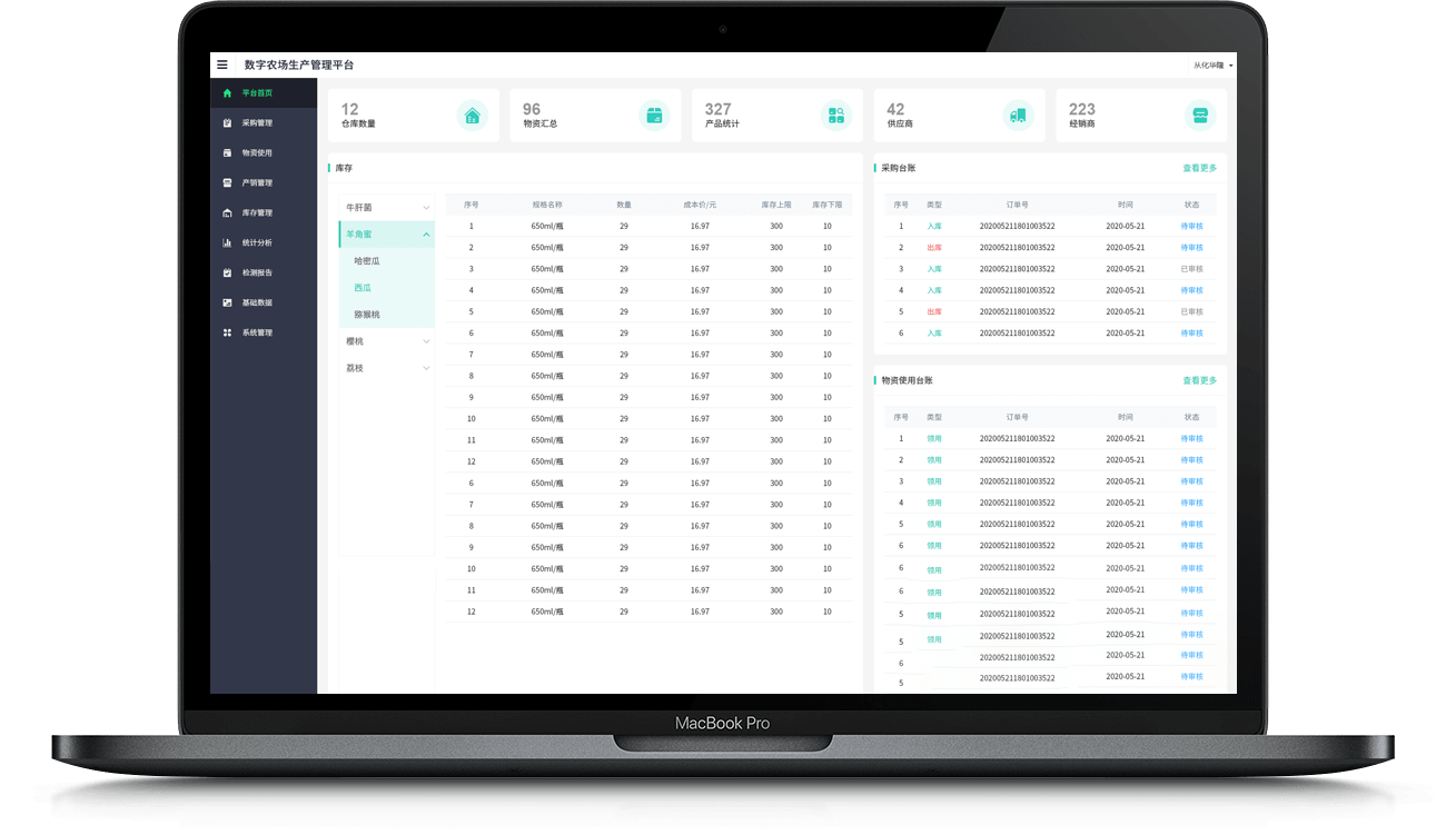 打通種植計(jì)劃 > 農(nóng)資采購 > 物資使用 > 產(chǎn)品采收 > 出庫銷售全業(yè)務(wù)流程,提升運(yùn)營效率。